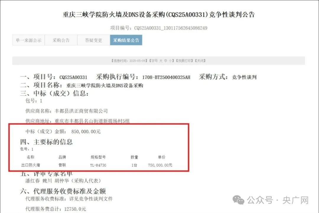 5月9日,“重庆市政府采购网”发布重庆三峡学院防火墙及DNS设备采购(CQS25A00331)中标(成交)结果公告:成交供应商丰都县洪正商贸有限公司,中标(成交)金额85万元。其中,主要标的信息标注了一台品牌规格型号为“普联TL-R473G”的单价为75万元,但其市场价仅为299元,成交价格高于市场价2500倍。