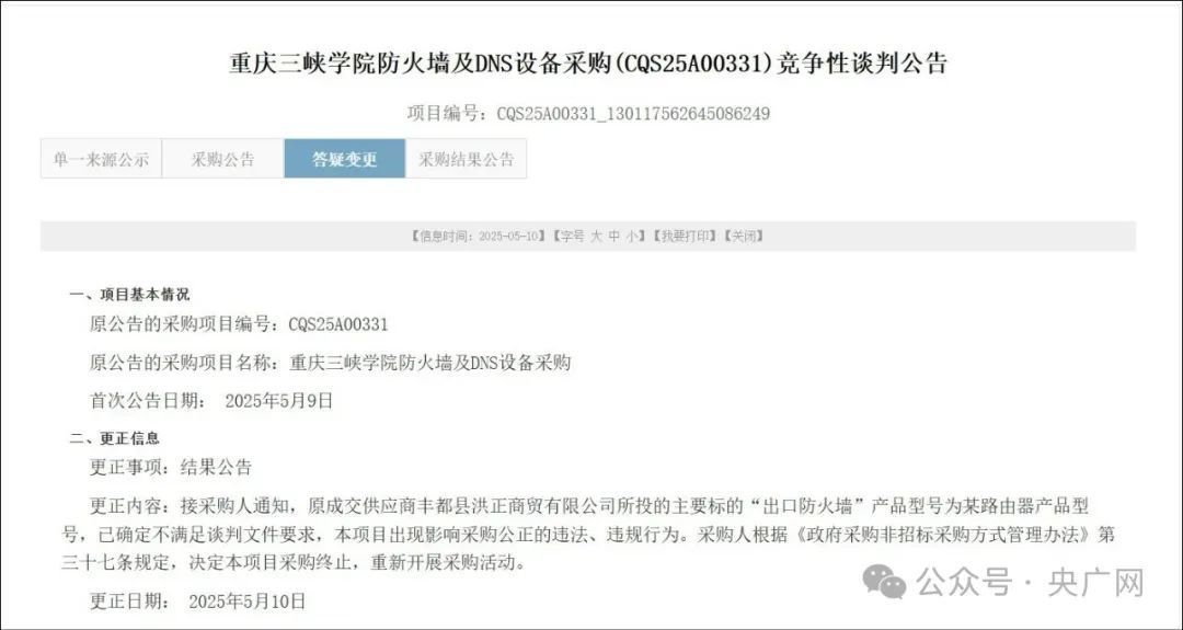 5月10日,“重庆市政府采购网”发布采购终止公告,更正信息一栏中显示,“接采购人通知,原成交供应商丰都县洪正商贸有限公司所投的主要标的‘出口防火墙’产品型号为某路由器产品型号,已确定不满足谈判文件要求,本项目出现影响采购公正的违法、违规行为。采购人根据《政府采购非招标采购方式管理办法》第三十七条规定,决定本项目采购终止,重新开展采购活动。”