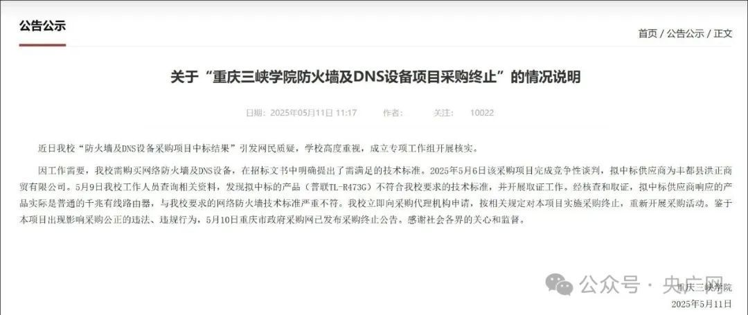 重庆三峡学院防火墙及DNS设备采购结果公告(央广网发 网络截图)
