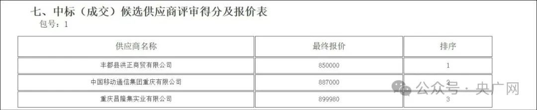 在重庆三峡学院防火墙及DNS设备采购(CQS25A00331)中标(成交)结果公告中,就显示了另外两家供应商的最终报价与排序。中国移动通信集团重庆有限公司最终报价887000元,排名第二;重庆昌隆集实业有限公司最终报价899980元,仅仅比采购预算金额90万元低20元,排名第三。